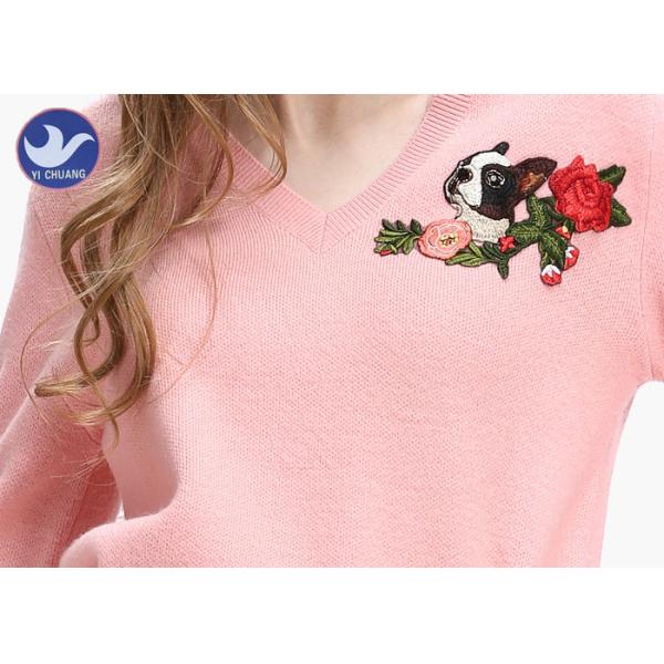 Pink Women's Long Sleeve Sweaters , V Neck Knitted Jumper Dog Flower Embroidered Patch Images |